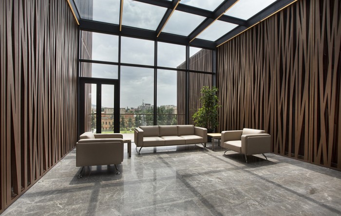 Since it appears that the wall is a series of repeated panels I would suggest making a curtain wall panel family using an extrusion to model the pattern and then model the wall using a curtain wall and remove the mullions and have just the panels be the ones you made. It somewhat looks like the panels from the picture are roughly 4' x 12' but that is a guess based on how big I would guess the chairs and couch are in the picture.