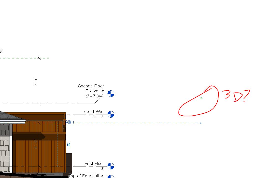 This plane I use for window heights. so I want to see it over all my facades / sides. So I went to my front view, Noted that it had the "3d" mark. but it still doesnt show on side elevation... So I stretched the plane (in the front view, to the right so it would show in the right side elevation...) and the plane immediately changed to "2d" and I still cant see it in my right side elevation.