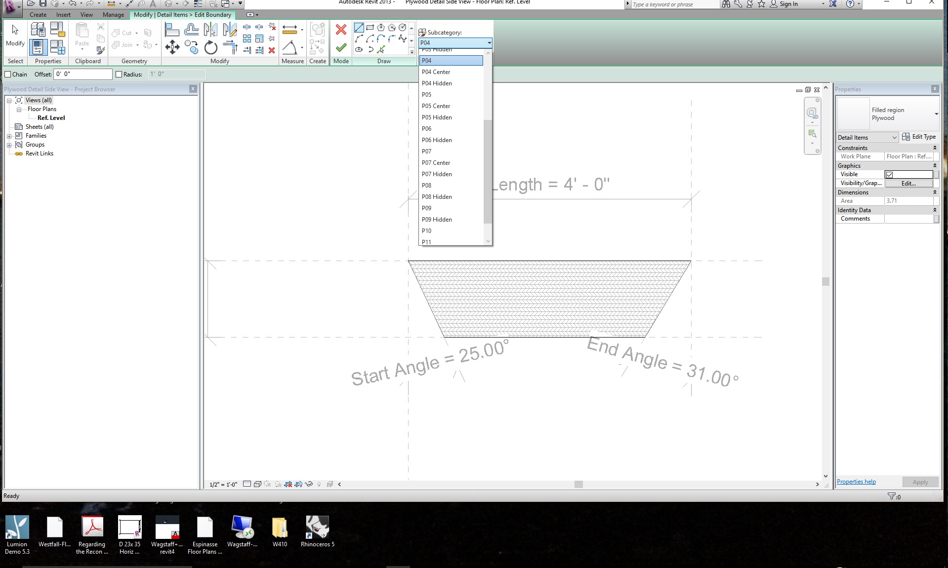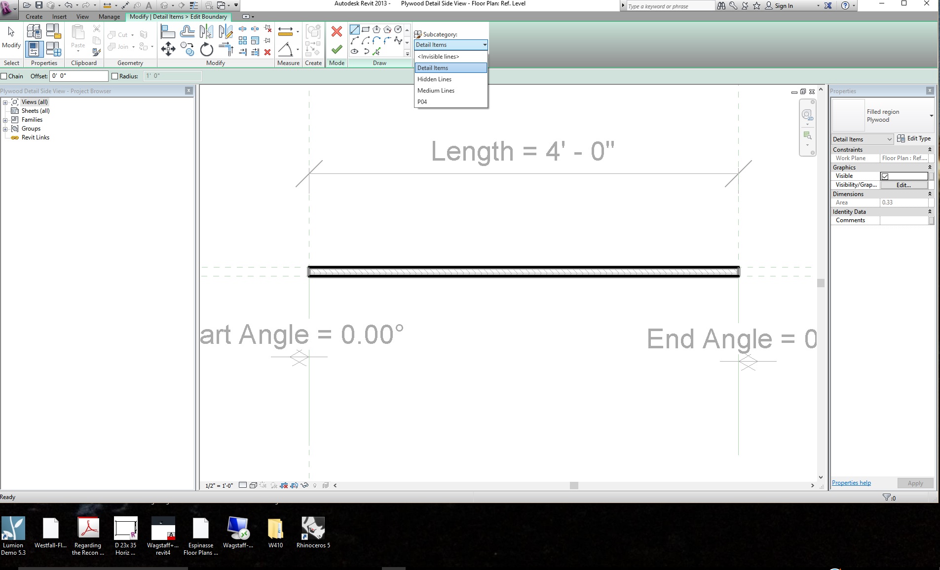 Im a little confused as to why you have so many line styles within your detail item family when it seems that you only have 4 lines drawn in the family itself (2 sides and 2 ends) and then the rest of the lines making the plywood is just a hatch.