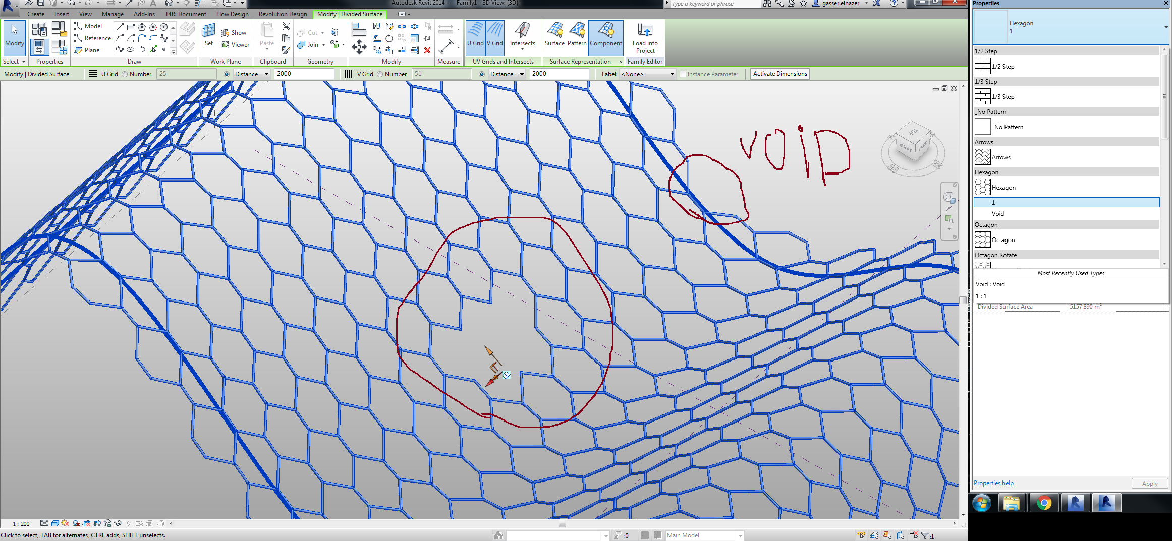 I now face a problem trying to assign a pattern to the edges of my divided surface. Note that there is a void form in the middle of the massing where my red arrows are pointing. I am trying to place bamboo beams through the divided surface grids I have achieved.