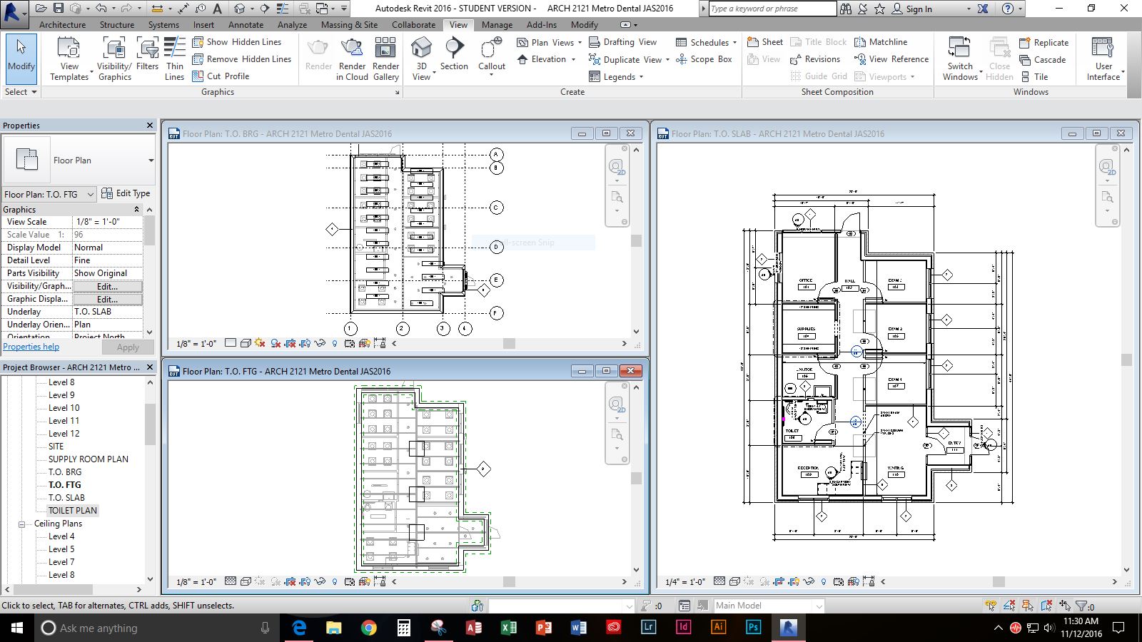 Right now my main problem is my grids. When I first started this drawing I laid out grid lines and all was well. Now my grids only show up on one out of three of my floor plans. I have checked the hide elements and they are not hidden. I don't know how to get my grids back on all of my drawings that require them. My teacher will take points off if my drawing is missing elements.