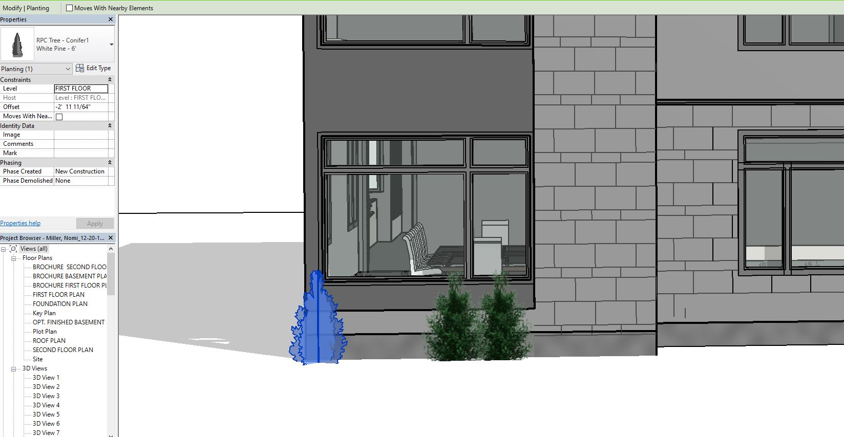 I'm pretty new to Revit and have come across a weird issue. I have multiple instances of the same compenent (a bush) in my drawing but for some reason only 3 of them are showing up in my 3d views. The others are still there and I can select them, they are just "ghosts" though. I'm sure it's something simple I'm missing but any thoughts? Attached are a few screen shots...thanks in advance!