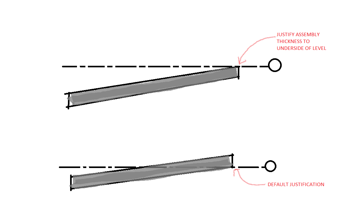 I think I'm blanking on the method here and I'm hoping someone can set me straight. Is there a way to have the end thickness of a roof assembly be justified to level rather than from the level? See sketch. This probably is a different philosophy from how the tool is designed since I haven't been able to find a setting so far to change it, but if anyone has tried doing this please let me know! Thanks in advance!