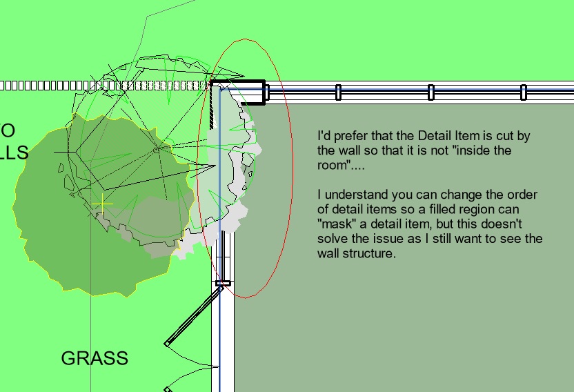 I had a question for the Revit gods. I am using Detail Items to show landscaping. The problem is that when a detail item is placed close to a wall, the detail item does not stop at the wall and I end up with the parts of the tree (for example) inside the building.