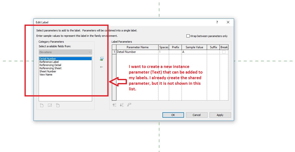 I hope this is the right place for my question. I am trying to create a custom elevation mark that matches the symbology used for detailing the rooms. We use letters for each elevation. I am trying to create a parameter for the elevations that can be detected by the elevation mark. However, when I am creating the label, Revit only allows me to use certain parameters within an "Elevation Category". I am not sure how to create a parameter that is included in this category. Please, check the attached images. It will make it easier to understand what I am trying to do.