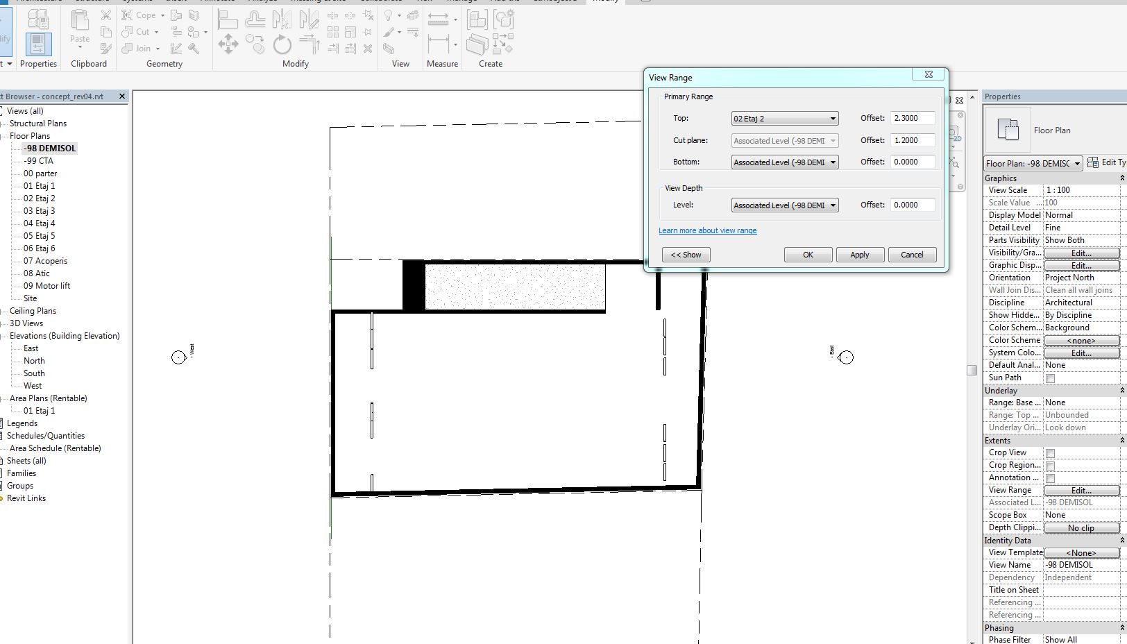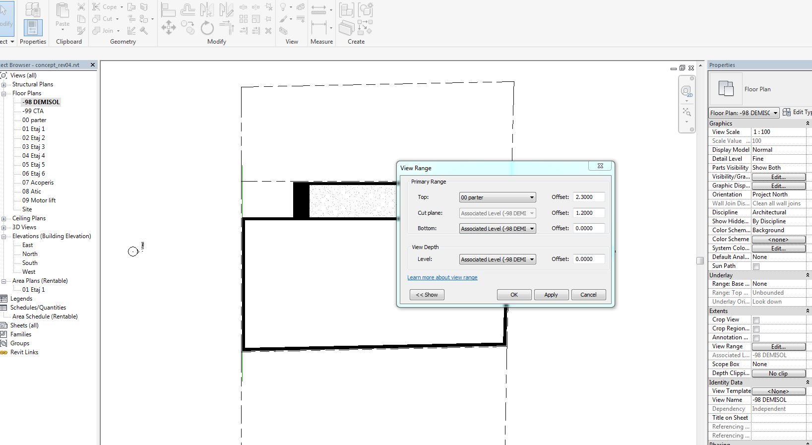 I'm currently switching from AutoCAD to Revit and have an issue: cannot see the walls from an above level, even if my view range is set this way. My view range only shows me cuts through some sunshade components - see attached screenshots. Why is this happening? Why can't I see the walls from above levels.