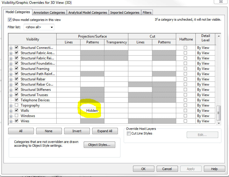 - I have verified that the wall patterns have not been overridden (either in object styles, visibility/graphics, or override graphics in view).