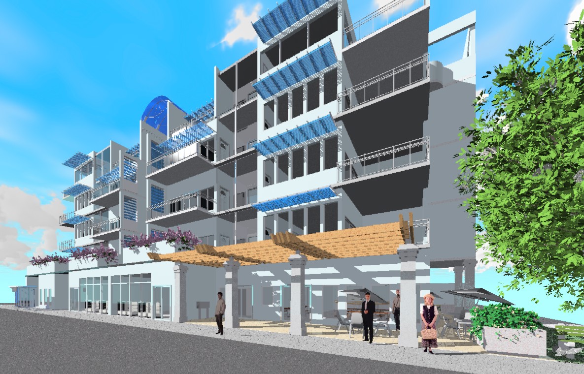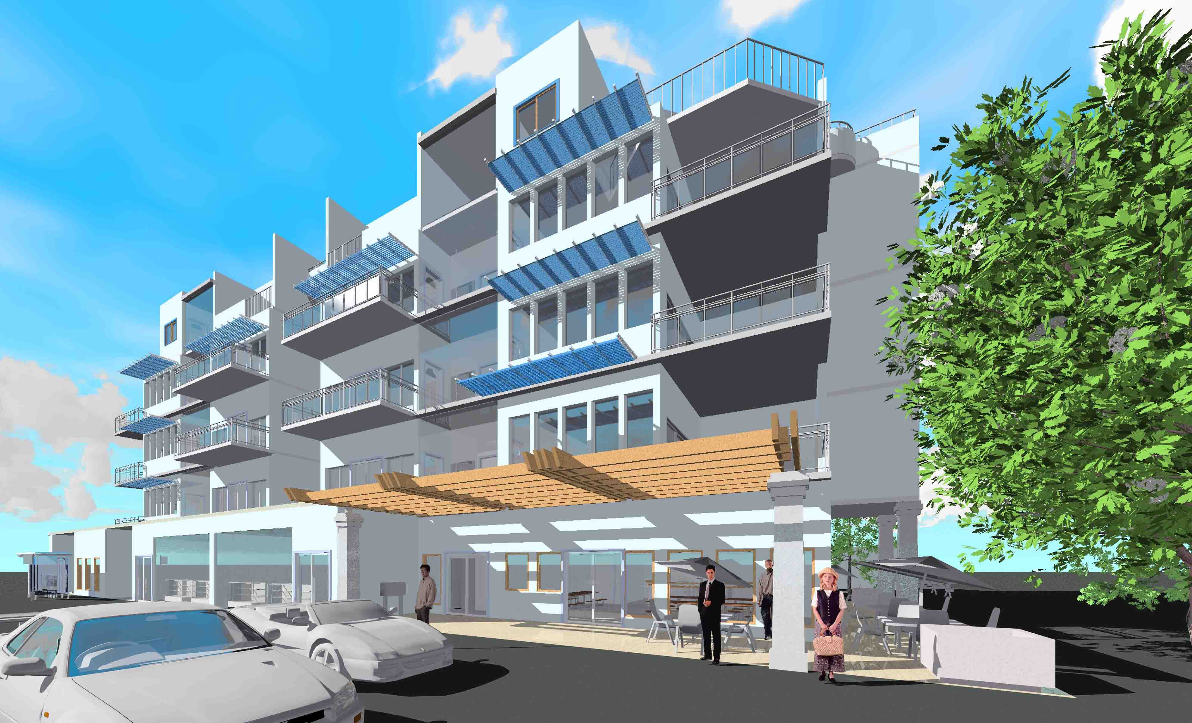 Well I think the design is not bad. There are just a few small things that you might want to take a look at. The railing on the top floor/roof on the right side of the picture is defferent then the rest, don't know if you wanted it that way. Also, on the larger windows you might think about adding window mulllions, One piece of glass that size would almost be impossible. One last thing, On the left side towards the center of the photo on the top floor. there are those two wall that go full height that seem to stick out to much on the patios. Maybe try and lowering the walls a few feet. Looks great though, post another photo after you do some more work on it. Hope some of this helps, I know I always like getting feedback too....