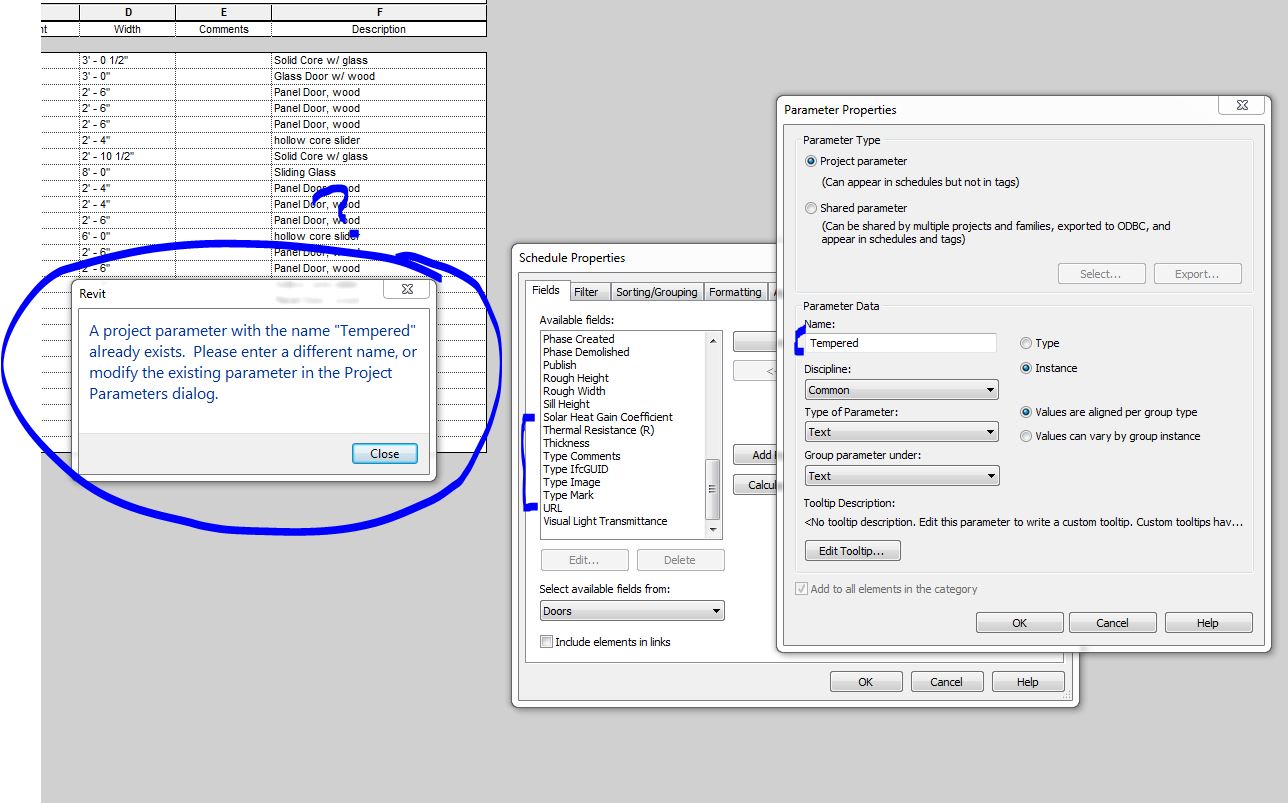 I want to add a "tempered" field to the scheduule. tells me that there is already a "tempered" in the list of parameter choices. But there isn't nor will it let me make the parameter from scratch. not sure how to deal with that. see pic. note the list doesn't show a temered parameter choice...same for both my wall schedule and door shcedule. Worked on my window schedule tho...