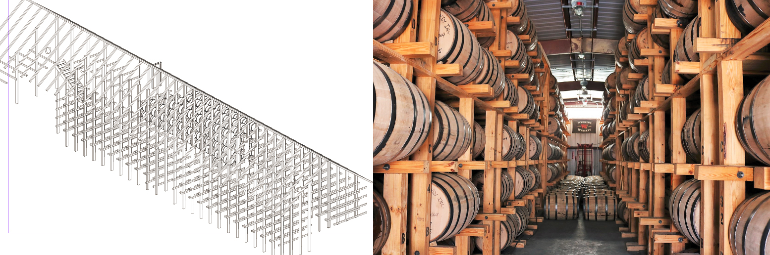 Now to my question: I am currently modelling a storehouse for whiskey barrels. The main concept is that the primary timber structure and the shelving are integrated and use tha same logic, grid and dimensions. I've attaced an image that show an early sketch of the overall structure and the principle of the shelving.