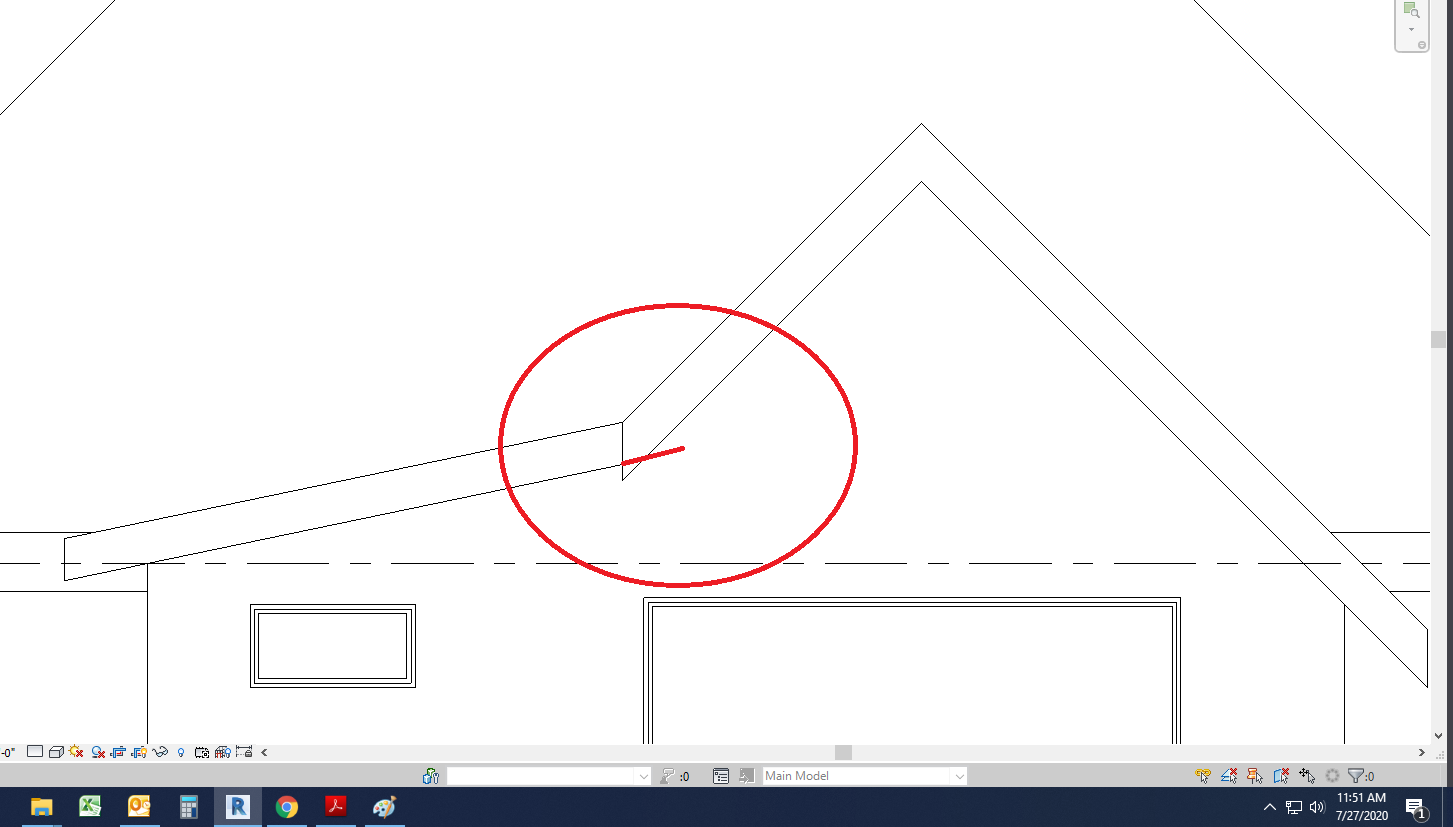 However, for the lower sloped roof, I left the rafter cut to plumb cut, joined the two elements, and moved the footprint line to where the detail lines intersected. This took some simple math, since I had to figure the 'x' distance out in elevation view, and then apply it to the plan view.