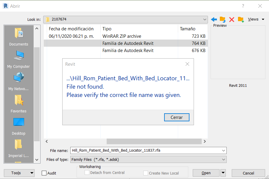 I tried going to the exact folder the family is in and just clicked on it so that revit opens it. It loads and even ask me if I wanna upgrade the file (I'm using Revit 2021) and keeps loading until it give me this error again [image attached].