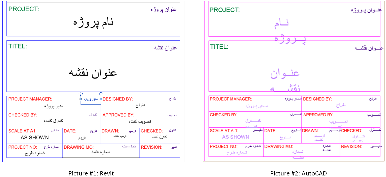 Hi all,I encountered a severe problem today exporting from Revit to AutoCAD (DWG).As shown in picture #1, in Revit all texts are in normal condition.Picture #2 shows AutoCAD DWG file made by Revit via EXPORT command.As seen comparing two pictures, the problem is changing the alignment of all Text (Mtext) objects to "Top-Left" ignoring the definition of Texts in Revit. Another problem is that changes in the margines of TEXT, wraps some MTexts in AutoCAD.Should any one can solve the problem?I apprecate any help or clue guiding me to study.