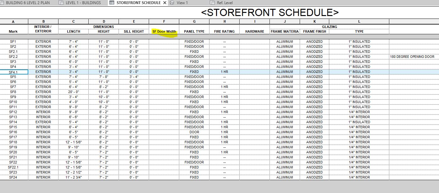 All 20 storefronts are shown on legend, elevations with dimensions. However, there are only three types on the door schedule, the same way as the regular doors.