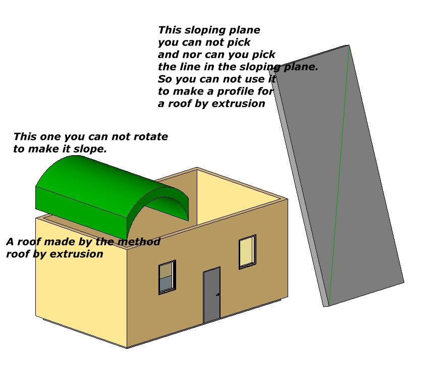 You also write that there are two ways to accomplish this. But I do not still believe in that. I have tried to pick a sloping plane,line or ref.plane to make the profile for a Roof by extrusion.