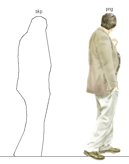 With the SKP file (see attached) you don't get the actual image showing up so you only see the silhoutte of the person, which is rather difficult to make out as a person. Would be alright for schematics. Also the scale of the file? What is it? I tried importing in as millimeter which made it a scale of 0.08333 which i had to scale up to 24.0 before it was human scale.