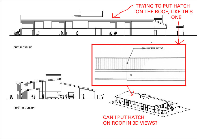 Hi there. Hopefully someone can help - i've done alot of searching on the internet and help menu, but no luck so far. As the attached file shows, I'm trying to put a hatch on my roof, but can't seem to get it to be visible. I've been trying to put on the steel pattern, under 'coarse scale fill pattern'. I'm only working in hidden line mode, because my computer is too slow to cope with 'shading with edges'. I just want the outline and hatching, that i will colour in photoshop for presentation drawings. Any advice would be greatly appreciated. Thanks Sarah