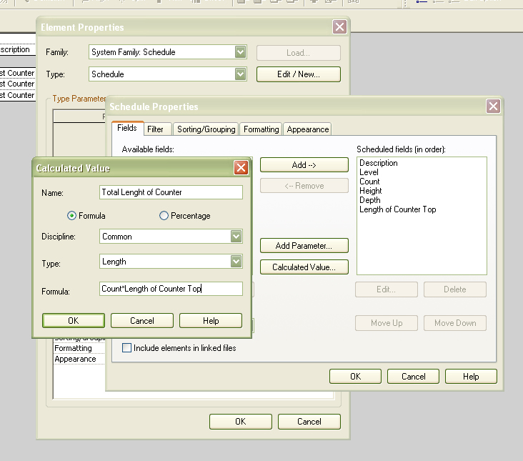Dang. I had a good detailed response, clicked the wrong button and lost it. So here is a quicker version. It looks like the formulas are ROW SPECIFIC, but "Count" would be dependent on the number of table entries of instances (right?). Let's say you were able to get a "running total" going for the "Count" field, you would end up with a "running countertop length" in the Total Length of Counter Top field. At that point, you might still have a problem depending on how the Revit program is written. The Count field would have to be calculated BEFORE the Total Length of Counter Top Field, or you would get an error, OR unpredicable results. So, where does the "Count" value come from? As an asside, if forumlas can only be written for values within a row, then you won't be able to come up with a running total, since you need information from the previous row (add 1 to the count from the last row).