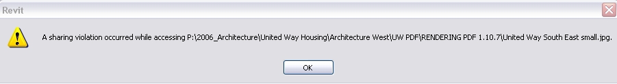 I have started work this morning with a new error message from Revit. The file that I am trying open is a workset file. Two other people in the office are able to open their local versions of this file. I was the last person to save to central last night. Today I get a message that says there is a sharing violation when opening a .jpg file that I made 2 months ago. The crazy part is that the .jpg file was created in Photoshop, and isn't imported, linked, or associated with the Revit file in any way. Except that it was made with from a .jpg rendering that Revit exported under a different name. Has anyone tackled this problem already. Is the fix something I can do quickly, so I can get back to work? As always thank you for your time and help. p.s. I have posted this on UIGI, but have not yet received an answer that helps. If I get an answer there I will post it here, and visa versa.
