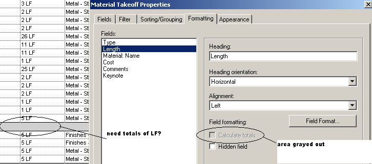 I've found I'm unable to get a total or grand total for linear feet in a material takeoff for walls! anyone have a solution or work around? If I go to formatting and select Length, Calculated totals is grayed out?? anyone Bueller, Bueller! all responses greatly appreciated, if any!