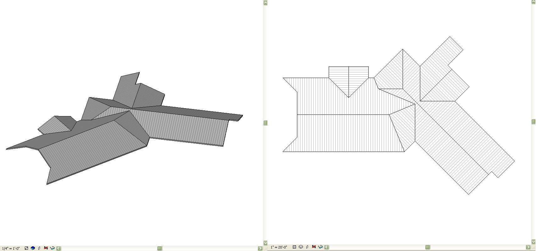 Yea it actually is one eave height so I guess I could do those two as one roof. I didn't even think of that. We have a pretty simple roof system but Revit thinks it is complicated and originally we tried to make it one roof. But Revit didn't make it correctly. Is there a way to fix this? The first image is what Revit did when we made it one roof. Then the second is what we did in order to make it work. We split it up into 7 roofs.