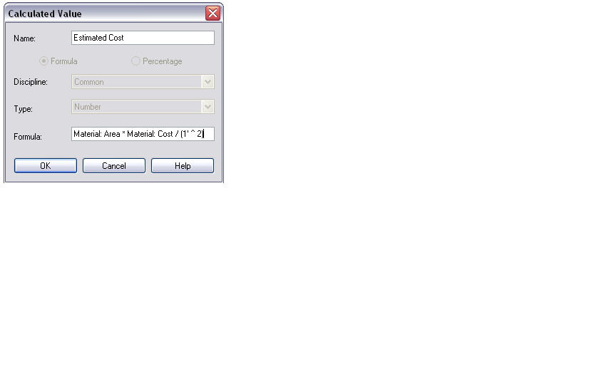 what you are talking, Revit recommends doing it this way: For Formula, enter Material: Area*Material: Cost /(1'^2). The /(1'^2) is required to remove the formatting of the fields so the cost estimate value can be calculated.