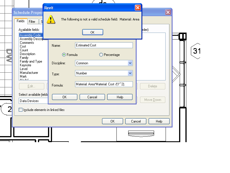 Hey Revit users, I just figured out how to get around the "Inconsistent Units" error in some formulas. I was trying to figure out a material cost per sq ft formula. I set up a calculated value in a material takeoff and wrote the following as the formula. Total cost = (Material: Area/1) * Material: Cost. I put the area/1 to return a "number" type instead of an "area" type and that allowed me to multiply the result in the parenthesis by the cost parameter. You can use a similar method to figure total cost and unit cost in the same schedule.